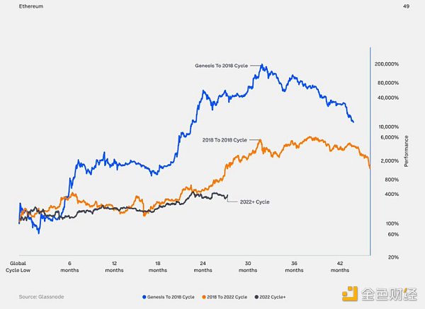 ETH已歷經(jīng)兩個(gè)完整的市場周期。本輪周期始于2022年,自2022年11月以來,ETH上漲了240%以上。本輪周期與2018-2022周期相似,ETH價(jià)格較低點(diǎn)上漲了6000%。