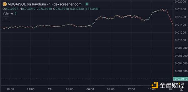 每一個低流動性池都是在過去 24 小時內跑路的項目。以 MBGA 為例,在過去 24 小時內,Raydium 上發生了 46,000 筆交易,交易量達 1,080 萬美元,2,845 個獨立錢包進行買賣,并產生了超過 28,000 美元的費用。(請注意,類似規模得到廣泛認可的LP,MEW,僅生成了 11.2K 筆交易)