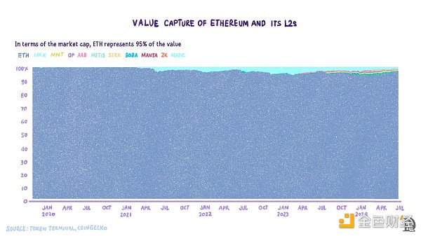 · 第一個(gè)途徑是看Ethereum是否會(huì)因?yàn)長(zhǎng)2而損失收入。我們可以通過研究Ethereum生態(tài)收入中Ethereum的收入份額變化的來檢驗(yàn)這一點(diǎn)。下圖是關(guān)于Ethereum和五個(gè)領(lǐng)先L2的收入。Ethereum一直占收入流的90%以上。